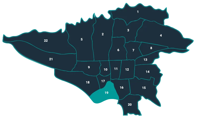 منطقه 19 تهران با داشتن 5 ناحیه و 15 محله در جنوب غربی قرار دارد. این منطقه از شمال به بزرگراه آیت الله سعیدی، از جنوب به پارک جنگلی افرا، از شرق به بزرگراه شهید تندگویان و خیابان بهمنیار، از غرب هم به اتوبان آیت الله سعیدی و بزرگراه آزادگان محدود میشود و شامل محلاتی همچون نعمت آباد، شهرک رسالت و عبدل آباد است.